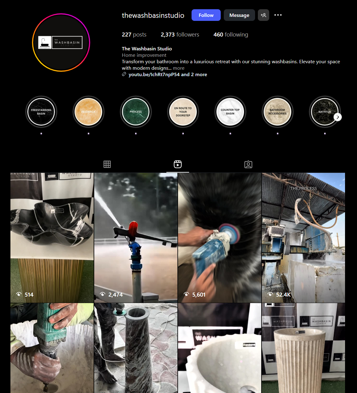 The Washbasin Studio is a luxury brand specializing in marble washbasins, countertops, and bath solutions. With a niche product line and premium audience, they needed a powerful social media presence to showcase their craftsmanship and reach potential buyers.